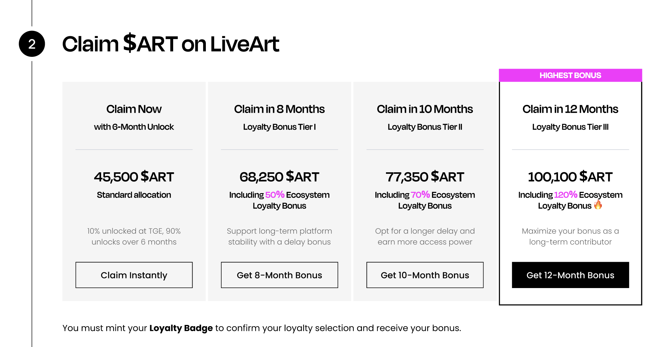- Delay Claiming: If you choose to wait and stake during the claim period, you can earn up to 120% more $ART through the Loyalty Bonus.