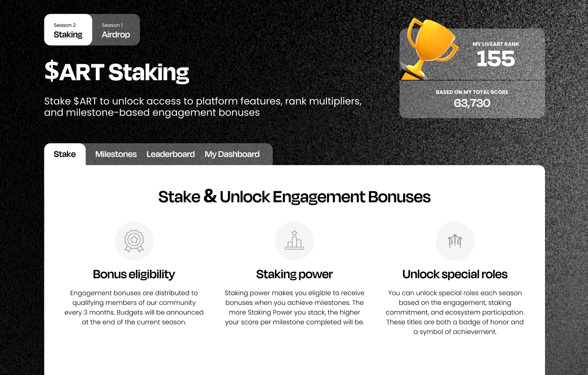 Staking $ART drives the protocol's rewards program. Unlocking access to platform features, rank multipliers, and milestone-based engagement bonuses. And is comprised of 4 components: