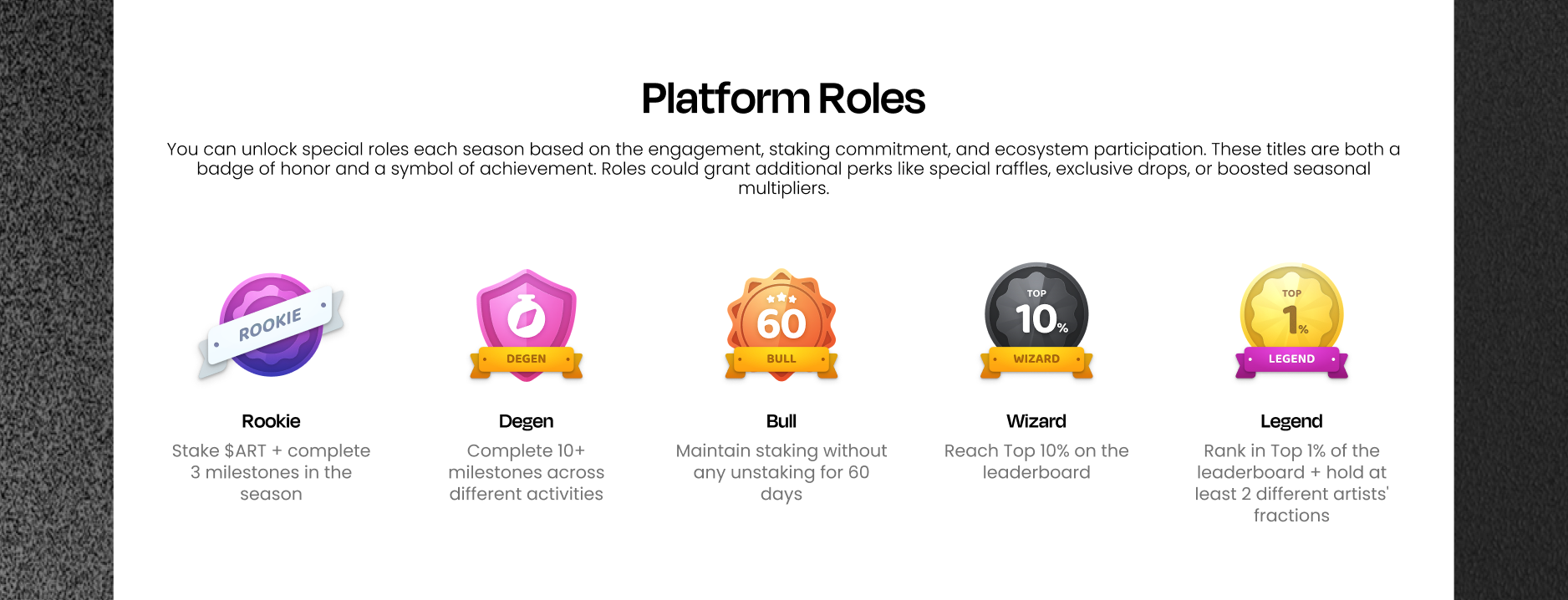 You can unlock special roles each season based on the engagement, staking commitment, and ecosystem participation. These titles are both a badge of honor and a symbol of achievement.