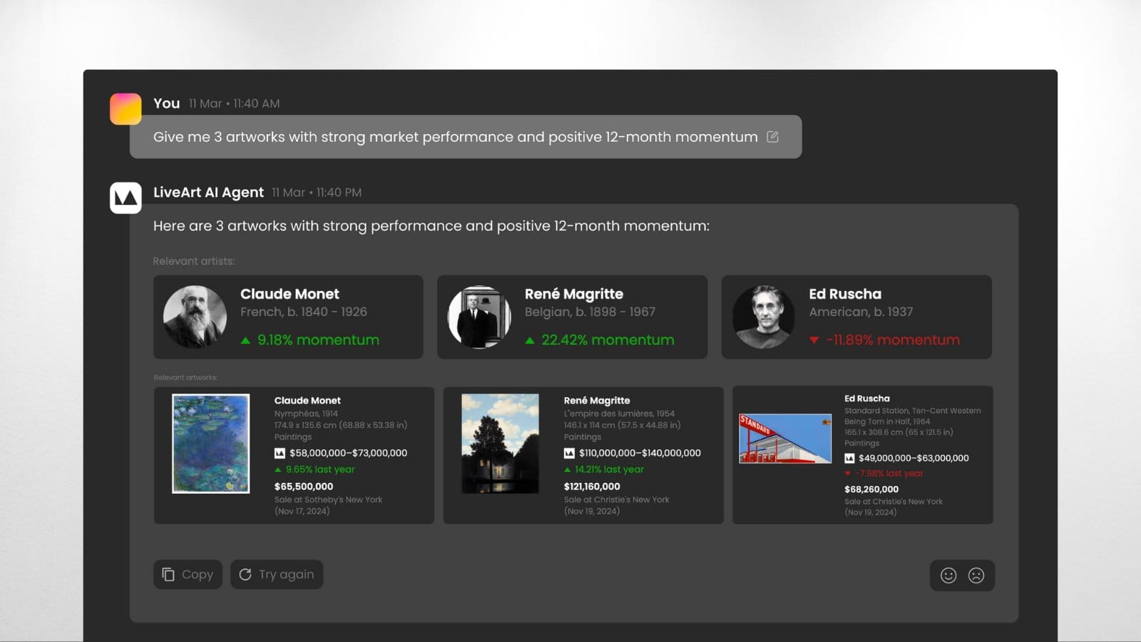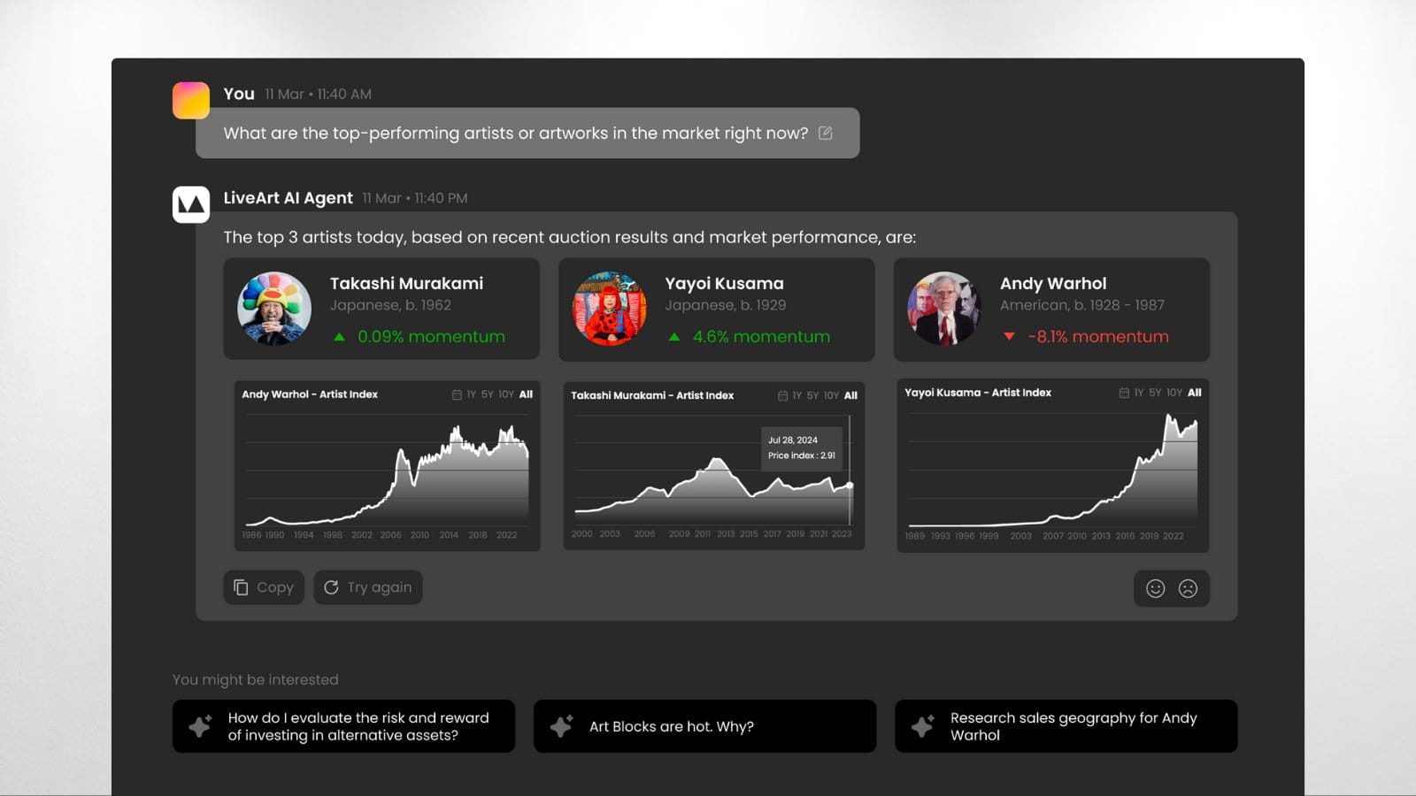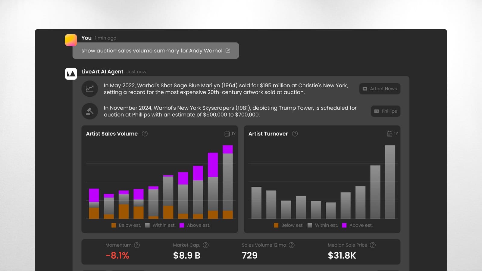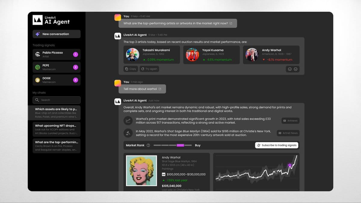 The LiveArt AI Agent removes those barriers, making art and digital asset market insights discoverable, transparent, and accessible for collectors, investors, and institutions—whether they are experts or just getting started. And unlike other market intelligence tools, LiveArt AI Agent is currently completely free to use—democratizing access to expert-level insights for everyone.
